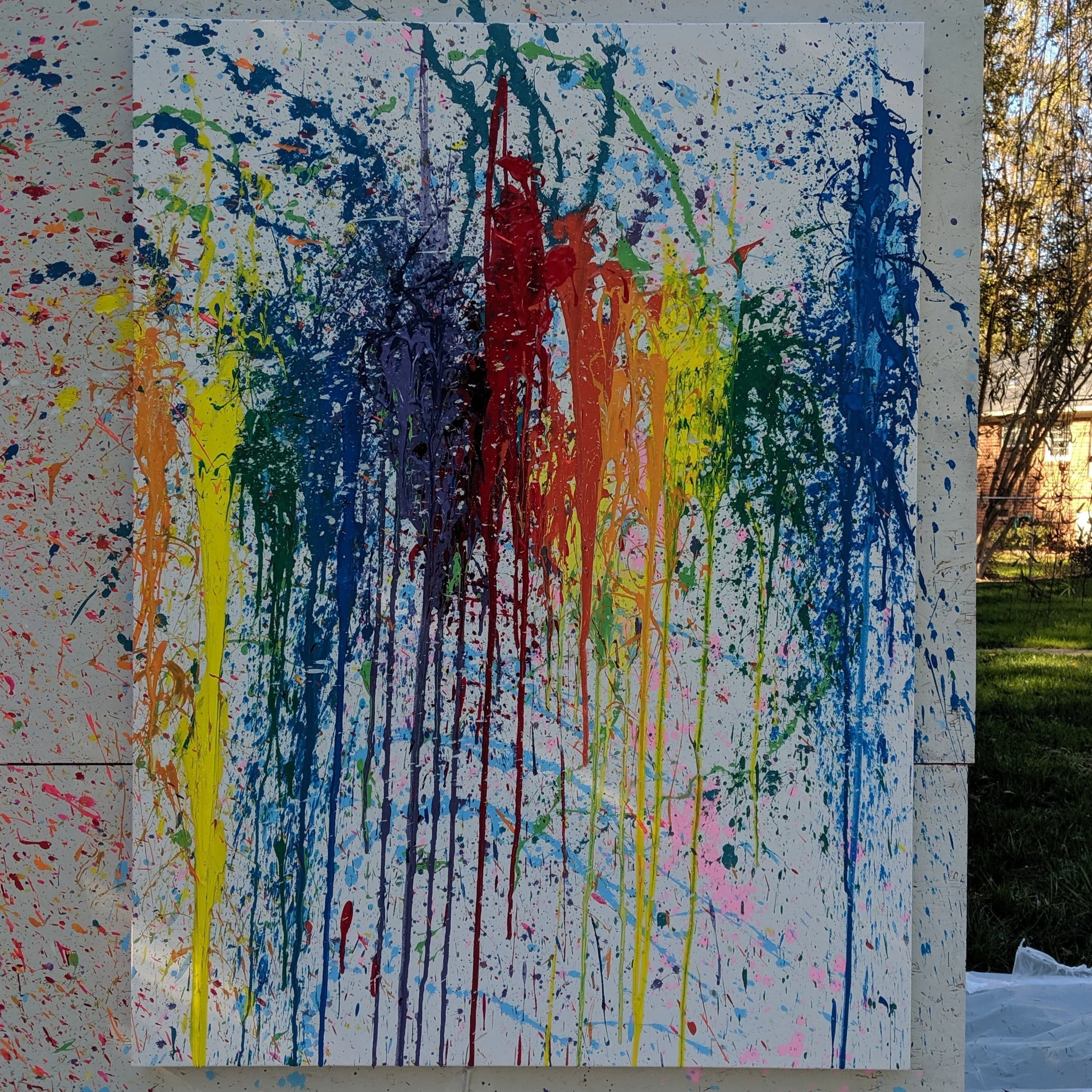 I don’t know how to paint. I never took an art class after 9th grade. I thought it would be fun to try throwing paint at a big canvas, but I didn’t want to hang up tarps in my apartment and get paint all over the place.